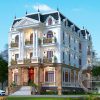 Sự xa hoa trong thiết kế không cần đến từ những chi tiết quá nhỏ nhặt mà nó toát lên qua những cánh cửa rộng lớn, qua các khối trụ, cột, các kết cấu Baroque  hay đại sảnh đón hình tròn cầu kỳ như một cung điện nguy nga. Cạnh cửa ra vào đặt 2 con hổ lớn, như khí thế vương giả, như tầm vóc của chủ nhà. Thiết kế trên một mặt bằng rộng, không cần phải quá cao, chỉ cần 2 tầng là đủ không gian sinh hoạt cho gia đình, thiết kế quá cao che khuất phần cảnh quan, khiến cho công trình trở nên chật chội và thừa thãi không gian. Bốn trụ tròn kiểu Ionic cùng khối mái sảnh tròn tạo nên một nơi bước vào, nơi đón tiếp rất lịch sự và trang hoàng. Phần trụ Corinth xung quanh tuy chỉ trang trí phần đầu cột nhưng vẫn toát lên được phong cách quý tộc châu Âu. Căn nhà sử dụng màu trắng, làm nổi bật các chi tiết như cửa sổ, kính, ánh đèn nội thất và khối mái. Kiểu mái Mansard càng tôn dáng căn nhà, đặt trên một thiết kế càng tăng vẻ đẹp hoàng gia và khí thế đồ sộ, lại tạo được thêm một tầng áp mái, giúp giảm nhiệt bên trong cho công trình, phủ bên ngoài bằng tấm lợp giả ngói.