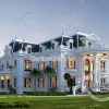 Sự xa hoa trong thiết kế không cần đến từ những chi tiết quá nhỏ nhặt mà nó toát lên qua những cánh cửa rộng lớn, qua các khối trụ, cột, các kết cấu Baroque  hay đại sảnh đón hình tròn cầu kỳ như một cung điện nguy nga. Cạnh cửa ra vào đặt 2 con hổ lớn, như khí thế vương giả, như tầm vóc của chủ nhà. Thiết kế trên một mặt bằng rộng, không cần phải quá cao, chỉ cần 2 tầng là đủ không gian sinh hoạt cho gia đình, thiết kế quá cao che khuất phần cảnh quan, khiến cho công trình trở nên chật chội và thừa thãi không gian. Bốn trụ tròn kiểu Ionic cùng khối mái sảnh tròn tạo nên một nơi bước vào, nơi đón tiếp rất lịch sự và trang hoàng. Phần trụ Corinth xung quanh tuy chỉ trang trí phần đầu cột nhưng vẫn toát lên được phong cách quý tộc châu Âu. Căn nhà sử dụng màu trắng, làm nổi bật các chi tiết như cửa sổ, kính, ánh đèn nội thất và khối mái. Kiểu mái Mansard càng tôn dáng căn nhà, đặt trên một thiết kế càng tăng vẻ đẹp hoàng gia và khí thế đồ sộ, lại tạo được thêm một tầng áp mái, giúp giảm nhiệt bên trong cho công trình, phủ bên ngoài bằng tấm lợp giả ngói.